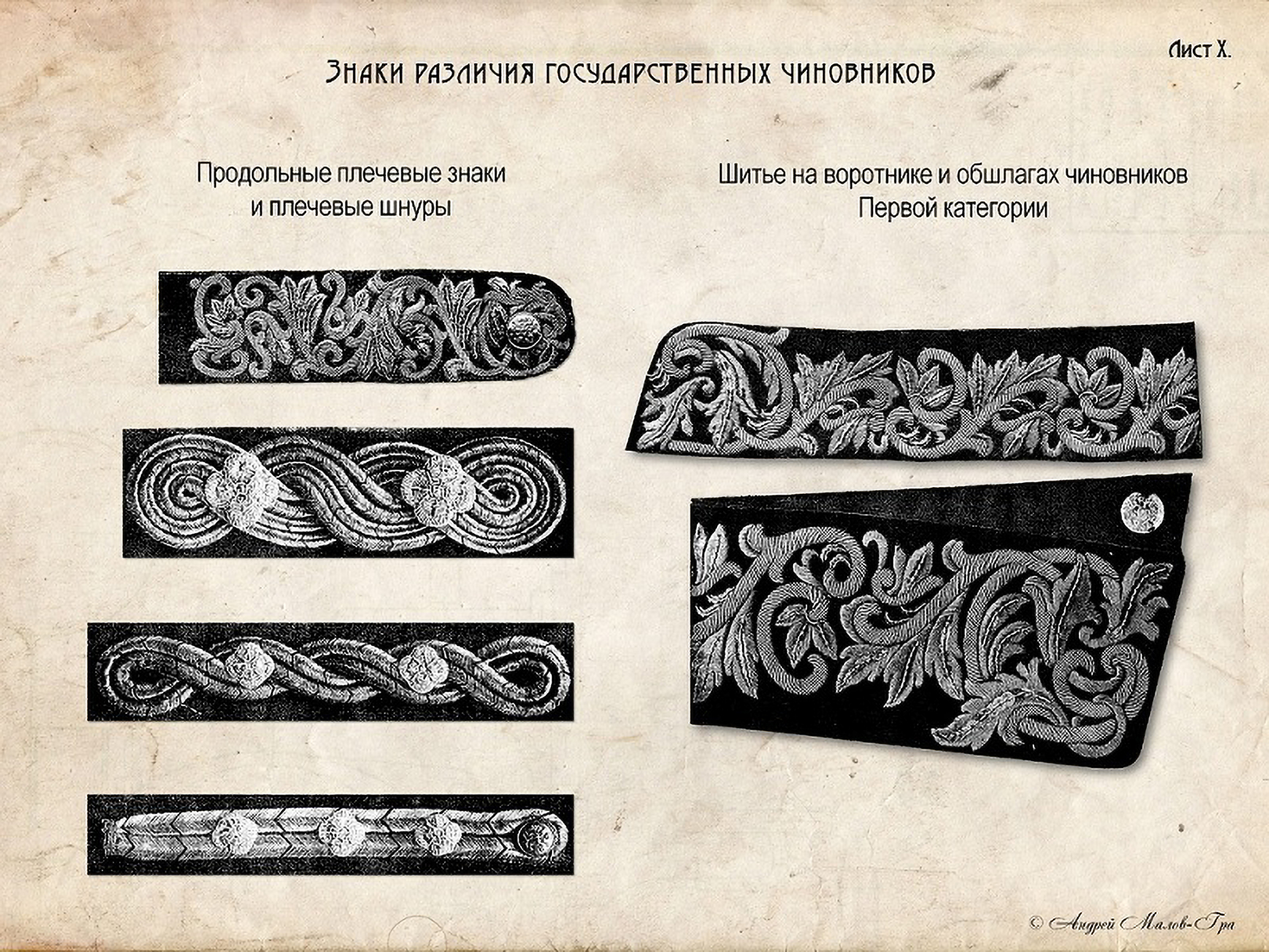 Знаками розрізнення рангів на мундирі для чиновників Першої категорії було шиття особливого малюнка на комірі та обшлагах з червоного оксамиту. Для чиновників Другої та Третьої категорій — срібні вишиті розетки на комірі та золоті галуни з особливим цивільним візерунком на комірі, обшлагах та зовнішніх швах штанів.