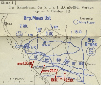 Величезна матеріальна перевага Антанти мала б показати себе в подальших боях 8–11 жовтня на ділянці Орн (Orne). Тут війська австро-угорського XVIII корпусу, які тепер підпорядковувалися німецькій армійській групі Маас-Ост (Maas Ost), вступили в найжорстокіші бої з американськими військами. Хоча разом з німецькими підрозділами вдалося запобігти повному прориву союзних сил, підсумки для австро-угорських військ виявилися вкрай сумними. Після тимчасового завершення боїв стало зрозуміло, що при подальших атаках Антанти такого масштабу, які супроводжувалися б великими втратами, від військ майже нічого не залишиться. Втрати 1-ї піхотної з 1 по 13 жовтня склали понад 5000 осіб — це більше 55% від чисельності на початку боїв. Наприкінці жовтня 1918 року в дивізії залишилося лише 2700 бійців. Через кілька днів майже 400 солдатів, отруєних газами, було евакуйовано з фронту.