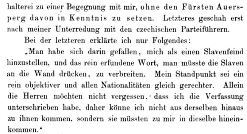 Чутку швидко підхопили. Проте 10 червня 1868 року на засіданні рейхсрату її зрештою прокоментував сам «винуватець». Тоді він саме лобіював будівництво залізниць у слов’янських регіонах імперії. І скористався нагодою, аби привселюдно заперечити, що є непримиренним противником слов’ян, як про нього говорять, і що коли-небудь говорив ті слова, які журналісти вклали в його вуста (скриншоти 1-2). А пізніше, в своїх спогадах, він стверджував, що мав окрему зустріч ще й з ватажками чеського національного руху, де заявив, що є прихильником рівного становища всіх національностей, і назвав оце «до стінки!» не інакше, як «чистою вигадкою» (скриншот 3).