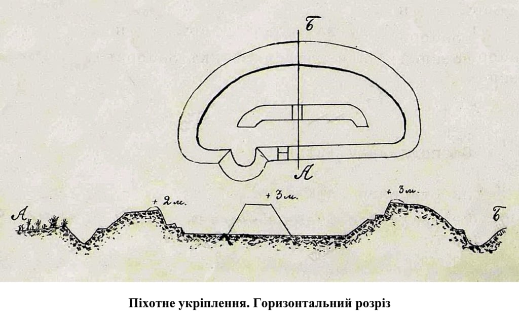Профіль піхотних укріплень був таким, щоб вони могли вистояти певний час проти обстрілу мортирами. Укріплення було добре замасковане в терені за допомогою дерев та кущів; передбачалися дротяні загородження.