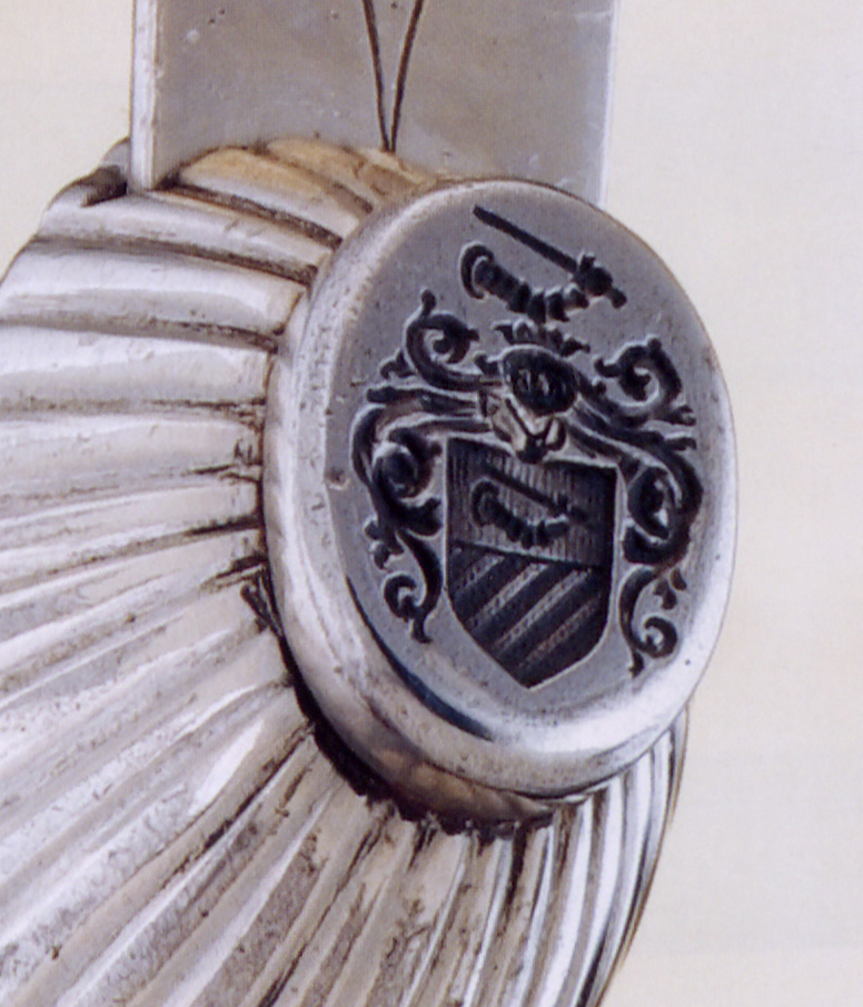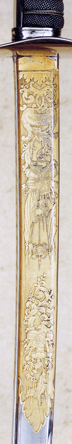 На головці руків’я вигравіювані сплетені ініціали власника «EG». Клинок має Т-подібний перетин і так званий «Пандурський наконечник» (Pandurenspitze): приблизно 30 см від вістря до обуха загострені, а паралельно до обуха клинка йдуть два жолоби. Перша третина клинка золочена та глибоко травлена візерунком з листям аканту. На клинку є позначка виробника «J.H. Haussmann, цісарський та королівський Придворний майстер з виготовлення мечів у Відні». Кільце на середній обоймиці піхов має додаткову горизонтальну перекладину, щоб запобігти зайвому зношенню ременя.