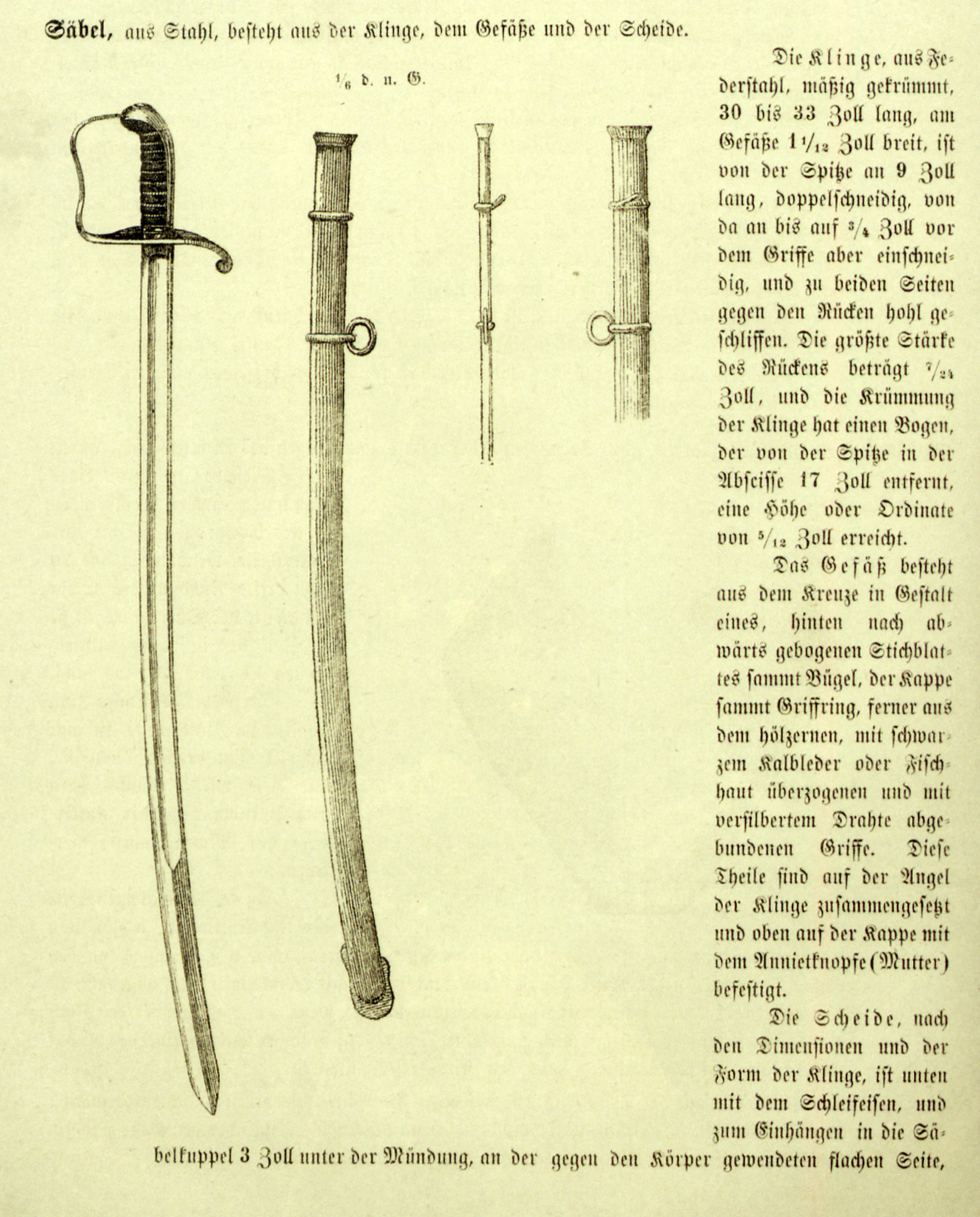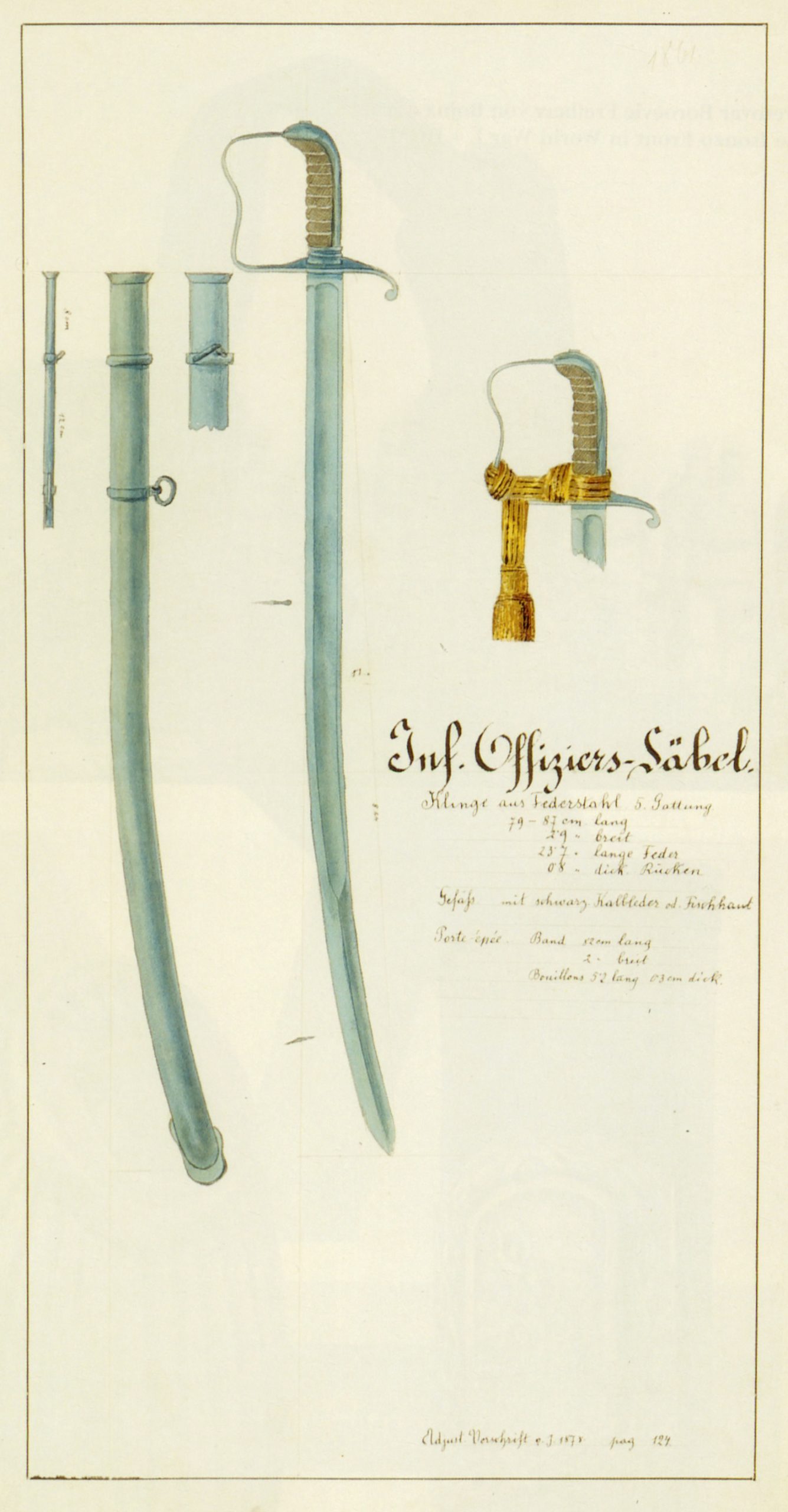 - Офіцерська шабля зразка 1861 року відрізняється від попередньої моделі тим, що на її піхвах є фіксоване кільце, прикріплене на широкій стороні біля гирла, як показують два види на цьому кресленні. Темляк (Portepee) також прикріплений цікавим чином, не використовуючи для цього прорізи, зроблені в руків’ї (ÖSTA/KA).