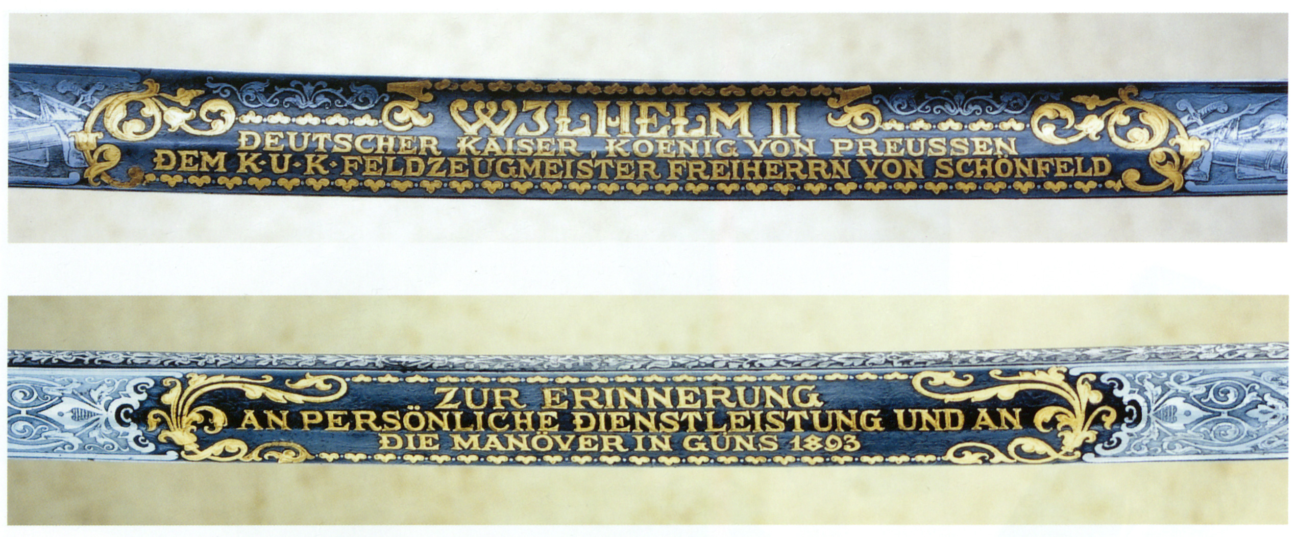 Його Величність, німецький імператор Вільгельм II, подарував барону цю церемоніальну шаблю після маневрів у Гюнсі в 1893 році. Форма шаблі є більш-менш статутною. Руків’я прикрашене золотом і має вирізаний золотий портрет Вільгельма II на спинці. Різьблені золоті прикраси на захисній дужці включають Двоголового Орла та Герб Шенфельда. Орнамент на спинці демонструє німецького імперського орла та монограму «W.II.R.». Дамаський клинок містить напис золотими літерами: «Вільгельм II — німецький імператор, Король Пруссії — цісарському та королівському фельдцейхмейстеру барону фон Шенфельду» та «На згадку про / особисті заслуги та / маневри, Гюнс, 1893 рік». На руків’ї та клинку є клеймо виробника: «цісарський та королівський Придворний та армійського зброяр Карл Грассер, Відень» (Karl Grasser Wien) (HGM).