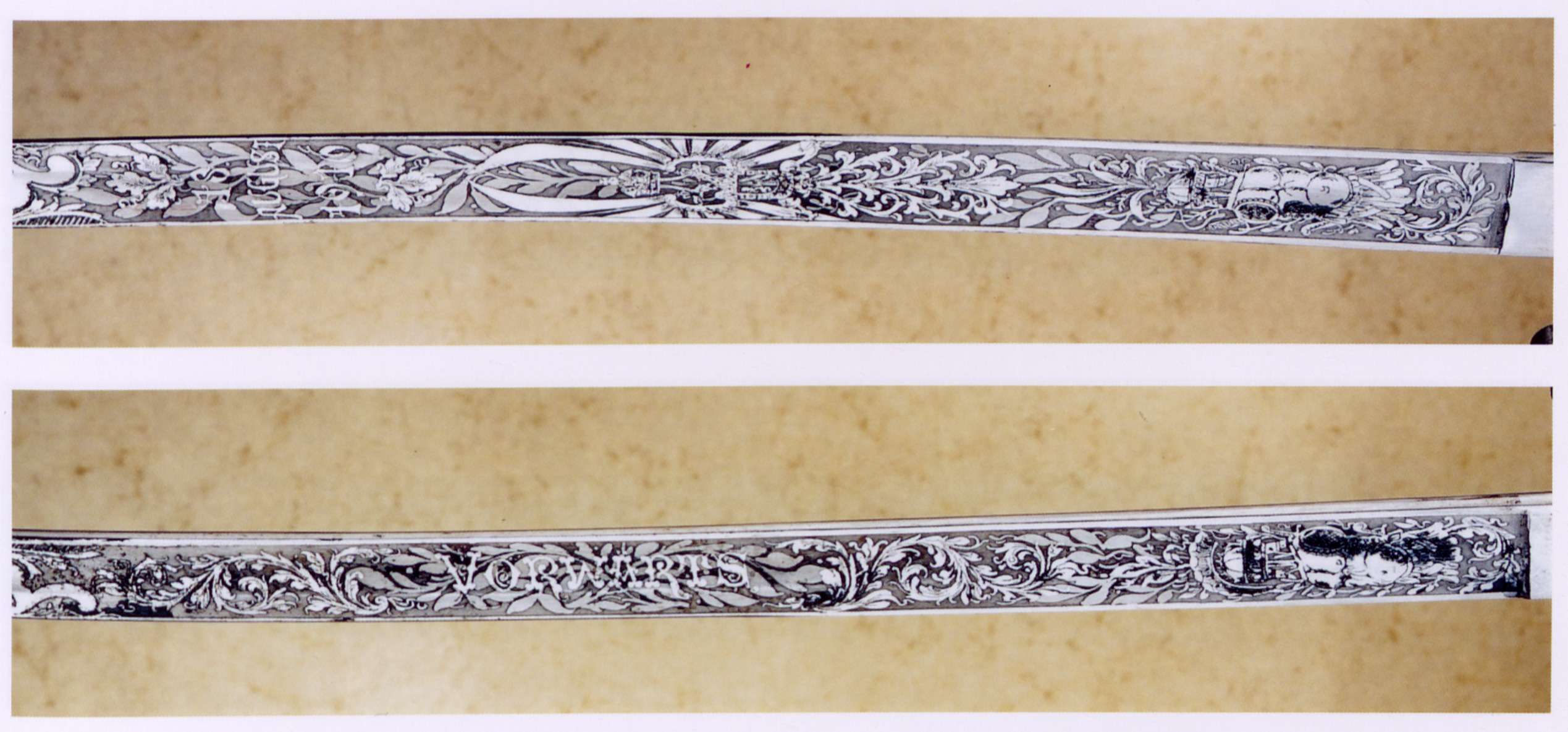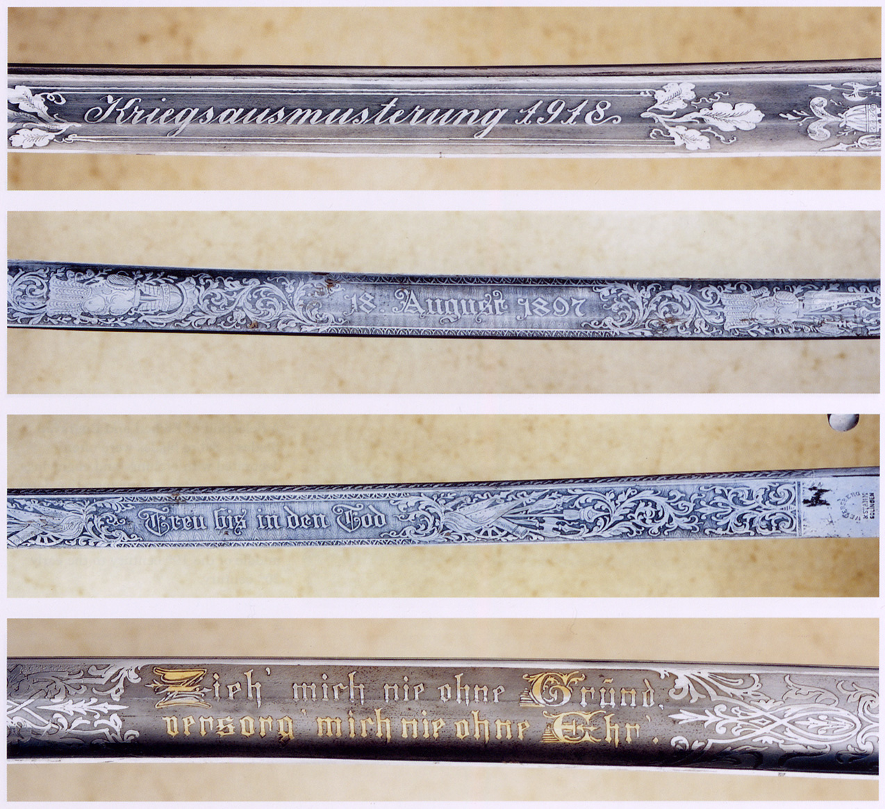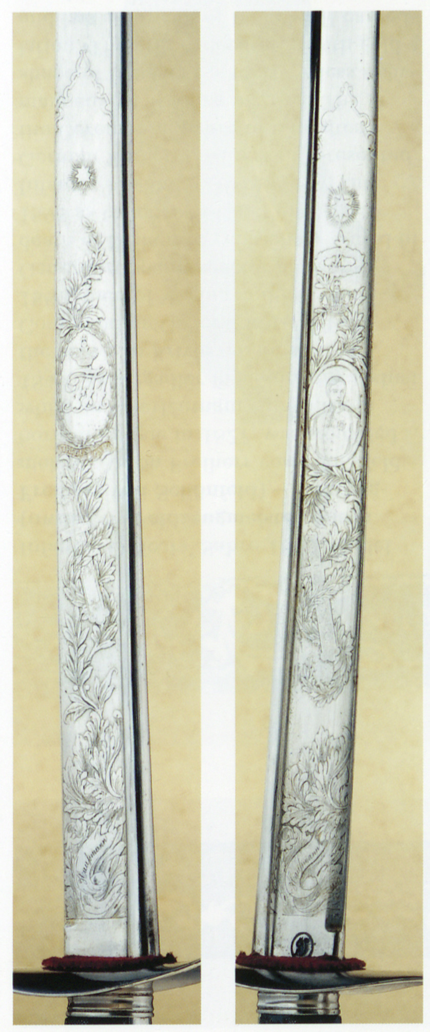 Клинки шабель часто прикрашалися травленням та гравіюванням. Це часто були пам’ятні дати, як-от битви, ювілеї або вихід на пенсію. Ці клинки ілюструють різноманітність художнього декору, модного із середини XIX до початку XX століття.