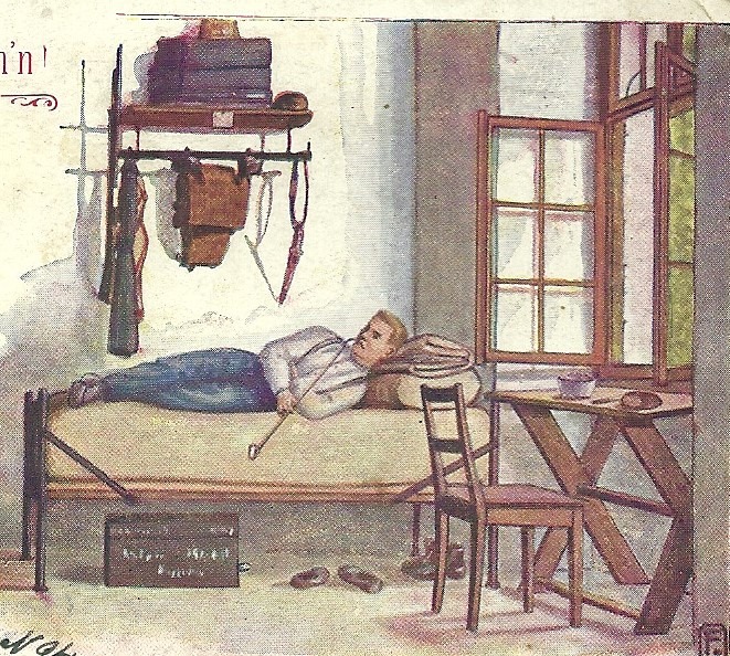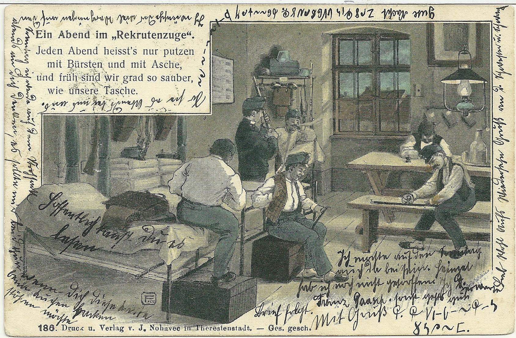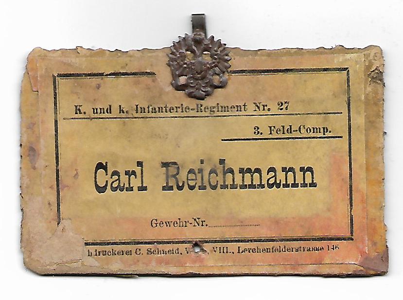 В книзі Гуго Шміда (Hugo Schmid) «Посібник унтер-офіцера» (Handbuch für Unteroffiziere), виданій автором власним коштом в 1915 році у Відні, в описі солдатського ліжка про іменні таблички жодного слова. Таблички обовʼязково мали увійти до цієї книги, що розбирає повсякденне життя військовослужбовця до останньої кістки, але… Натомість про них говориться в «Положенні про [внутрішню] службу імперських і королівських Сухопутних військ» (Dienstreglement für das kaiserliche und königliche Heer) 1909 року. В § 22, що визначає порядок у спальному приміщенні (Zimmerordnung), на стор. 60 частини I у пункті 142 сказано: «Над узголів’ям кожного ліжка стоїть табличка довжиною 11 см і шириною 8 см, на якій написані імʼя та звання людини».