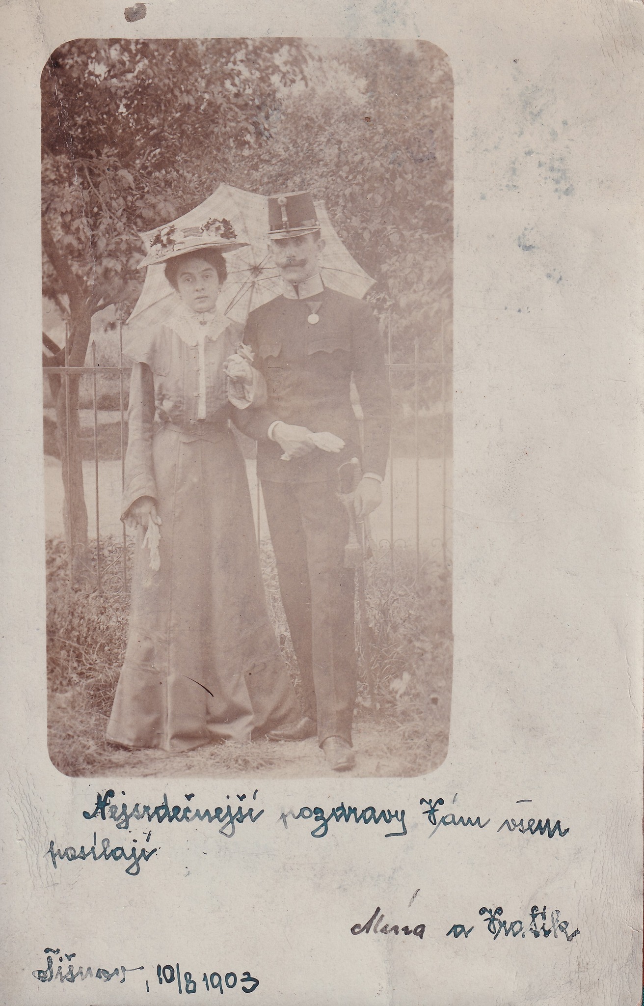 На перших двох фото, датованих 1899 та 1903 роками, зображено оберлейтенанта, у парадному та повсякденному одностроях, нагородженого «Ювілейною медаллю для військовослужбовців». Особливості одностроїв говорять про приналежність до «німецької» піхоти спільного війська. Усі фото підписані чеською мовою, з чого можна було б зробити висновок, що він чех і служив у чеському полку. Але ми припустили, що колір полку (тобто колір коміра та манжетів парадного кителя типу Waffenrock) і місто, де зроблено фото, можуть збігатися, якщо фото зроблено по місцю служби. У Брюні (зараз Брно у Чехії), в 1899 році квартирували три піхотних полки. По кольору більше за інших підійшов 49-й піхотний полк спільного війська барона фон Гесса (k.u.k. Niederösterreichisches Infanterieregiment Freiherr von Hess, Nr. 49), що набирали у Середній Австрії. Його колір був «щуче-сірий» (hechtgrau), тобто той самий, що й штанів оберлейтенанта. Те, що національність офіцера не співпала з національною приналежністю його можливих підлеглих, не має нас засмучувати — понімечення чехів було настільки шаленим, що в ті часи чеську вважали мовою прислуги. Чехи вивчали німецьку з дитинства, що, натомість, допомагало їм легко асимілюватися в чужому середовищі. Наприклад, напередодні Першої світової війни у Відні чехів мешкало більше ніж у Празі!