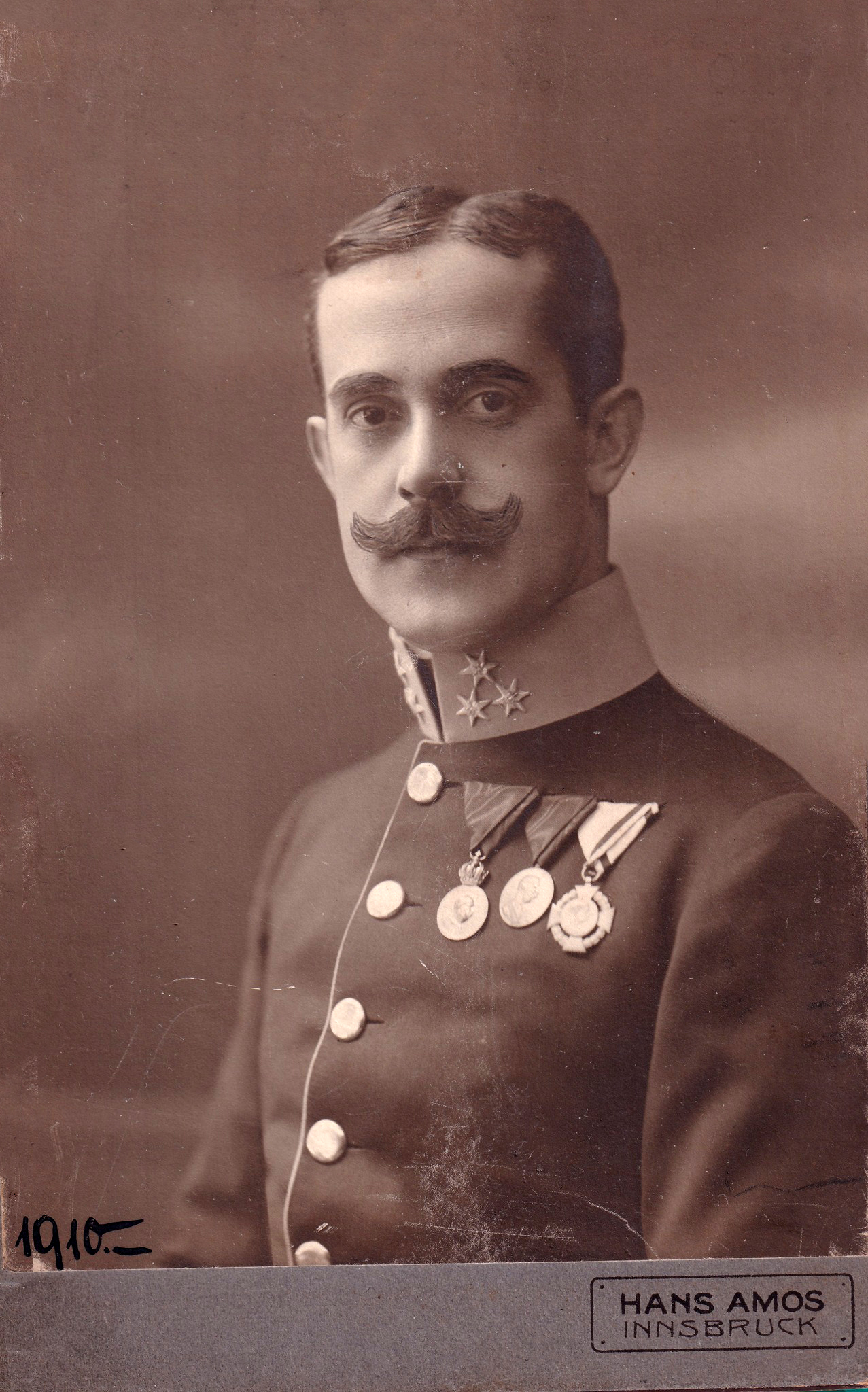 Прийшов час звернутися до третього фото, на якому наш офіцер вже у чині гауптмана, а паспарту фото помічено містом Інсбрук, столицею австрійського Тиролю. Фото датоване 1910 роком. У порівнянні з Брно Інсбрук набагато менше місто, тому й військових частин там було значно менше, а серед усіх офіцерів інсбруцького гарнізону підходив лише один — Вратислав Пех (Wratislav Pech), який з 49-го піхотного полку пішов ад’ютантом до піхотної школи кадетів (Infanterie-Kadetten-Schule), розташованої в Інсбруку. Плюс ще й співав набір нагород (до «Ювілейної медалі» за роки служби додалися «Медаль воєнних заслуг на стрічці Ордену Франца Йосифа» та «Ювілейний хрест для військовослужбовців»). І тут на око впало написання його імені! Німецькою мовою імʼя Вратислав починалося на літеру «W» на відміну від чеської, де першою була «V».