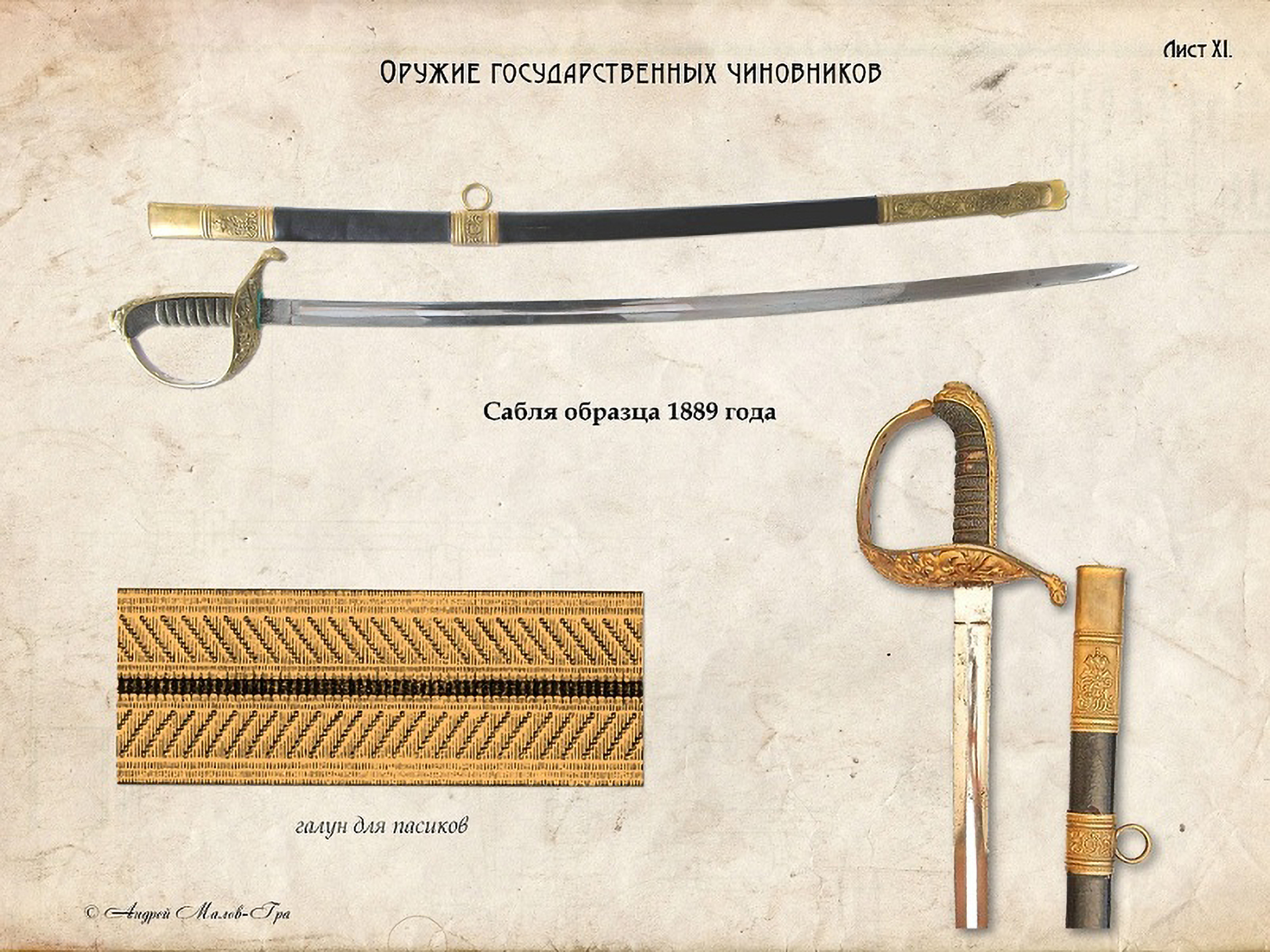 Озброювали чиновників цивільною шаблею зразка 1889 року в чорних шкіряних піхвах з позолоченим приладом, що замінила цивільну шпагу зразка 1849 р. На чашці ефесу та піхвах були рельєфні зображення рослинного орнаменту, державного герба та вензелю Імператора Франца-Йозефа. Пасики портупеї було прикрашено золотим галуном з чорним просвітом. Саму портупею з 1889 року завжди надягали під мундир або сюртук. Темляка не було.