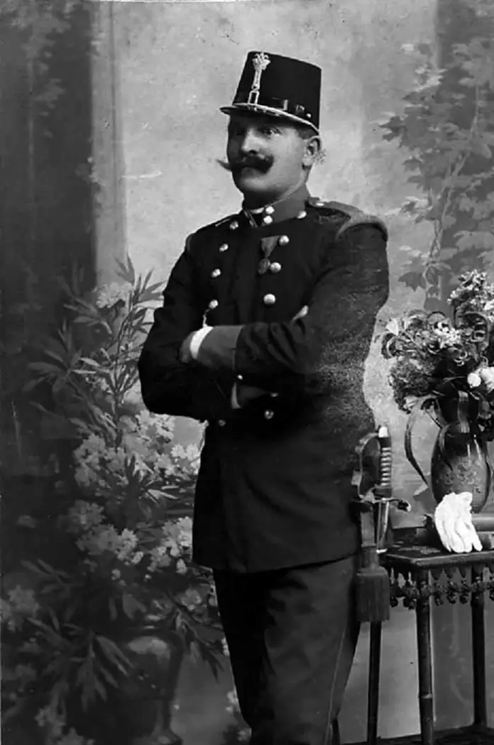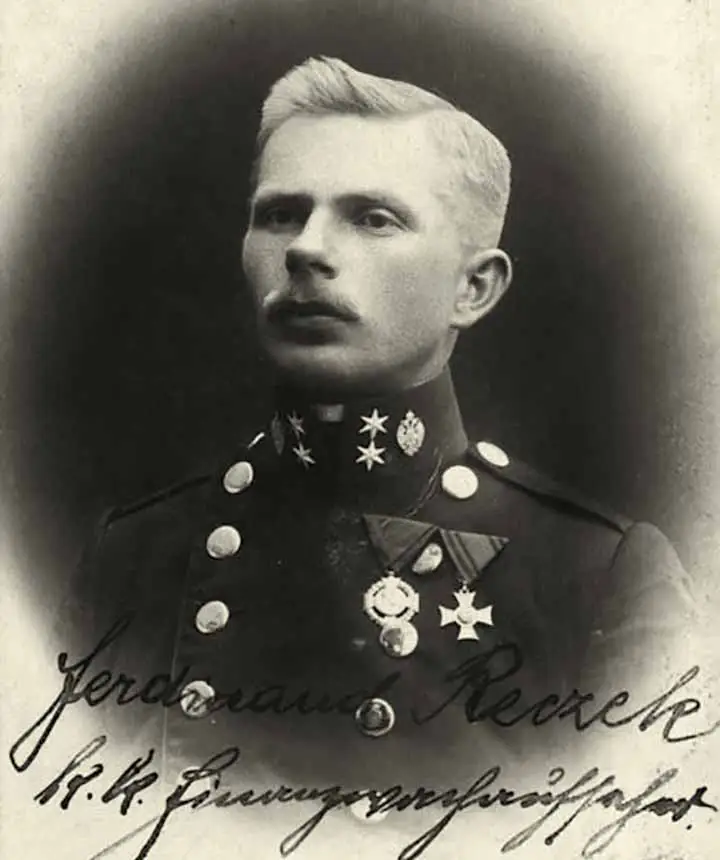 - Наглядач фінансової сторожі Finanzwachaufseher Фердинанд Печек вже має на комірі зірки замість розеток та службову емблему. Він нагороджений Ювілейним хрестом 1908 р., а також т. зв. «Мобілізаційним хрестом 1912/13 рр.» (Erinnerungskreuz 1912/13)