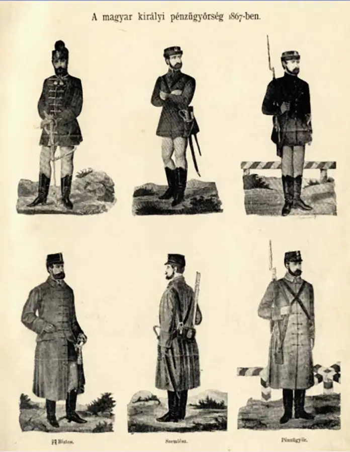 З 1867 року бере початок угорська фінансова сторожа (Magyar Királyi Pénzügyőrség). Вона використовувала службову форму з національними елементами, а її діяльність регламентувалась положенням 1868 року (зі змінами 1885 р.). Первісна форма була не дуже зручною для специфічної діяльності фінансової сторожі. До кінця 1870-х років було заведено нові військові зразки. «Капелюх мисливця», який викликав глузливі посмішки, замінило шако. Старші чини сторожі носили аттилу (Attila) і металеві розетки. Обов’язковим був герб Угорщини.