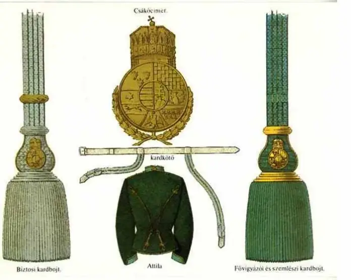 - Зразки форми угорської скарбової сторожі. Джерело: Szabó, Andrea. A Magyar Királyi Pénzügyőrség rangrendszere 1867-1947. Rendvédelem-történeti Füzetek (Acta Historiae Praesidii Ordinis), XXVII. évf. (2017) 54. sz. 27. 10.31627/RTF.XXVII.2017.54N.107-126P.