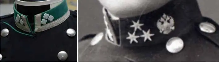 - Знаки розрізнення (Distinktonszeichen) — посріблені на погонах і позолочені на комірі.