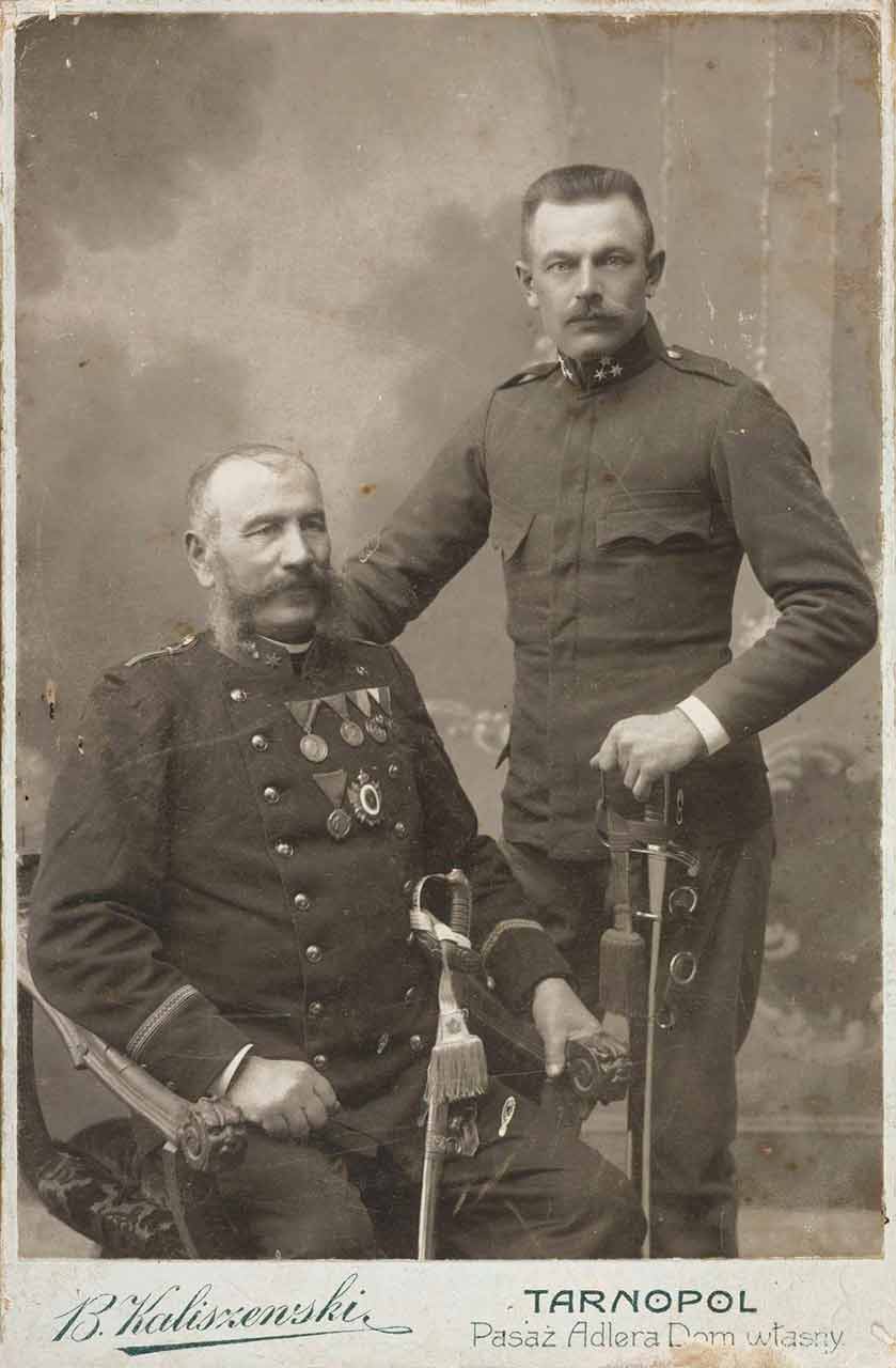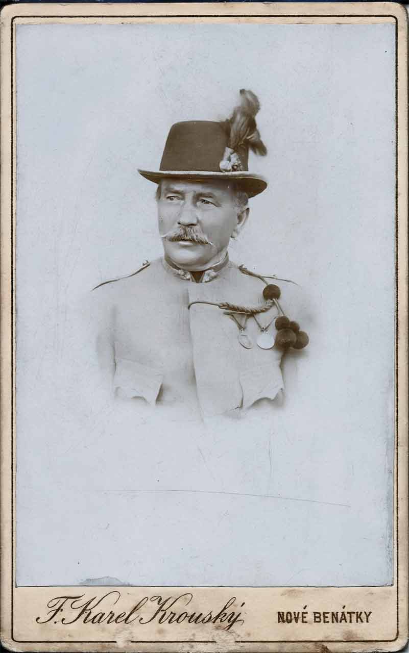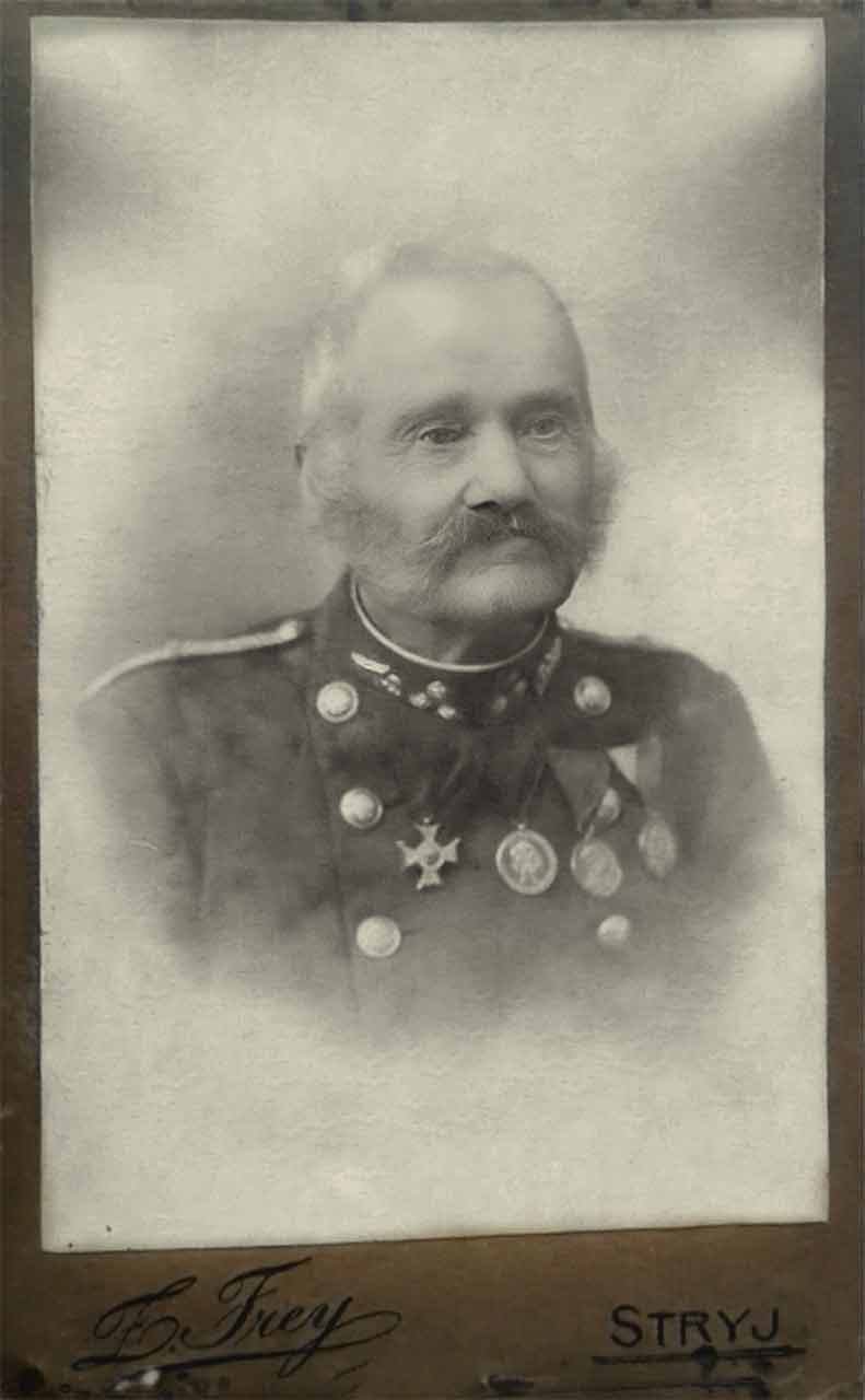 - Цугсфюрер Імператорського і королівського австрійського військового корпусу. Поруч з розетками на петлицях палаюча граната. Фото зроблено в Стрию. Ветеран нагороджений Воєнною медаллю (Медаль 2 грудня 1873 року); Ювілейною медаллю 1898 року. Остання нагорода Срібна пам’ятна медаль за народну оборону Тиролю в 1866 році