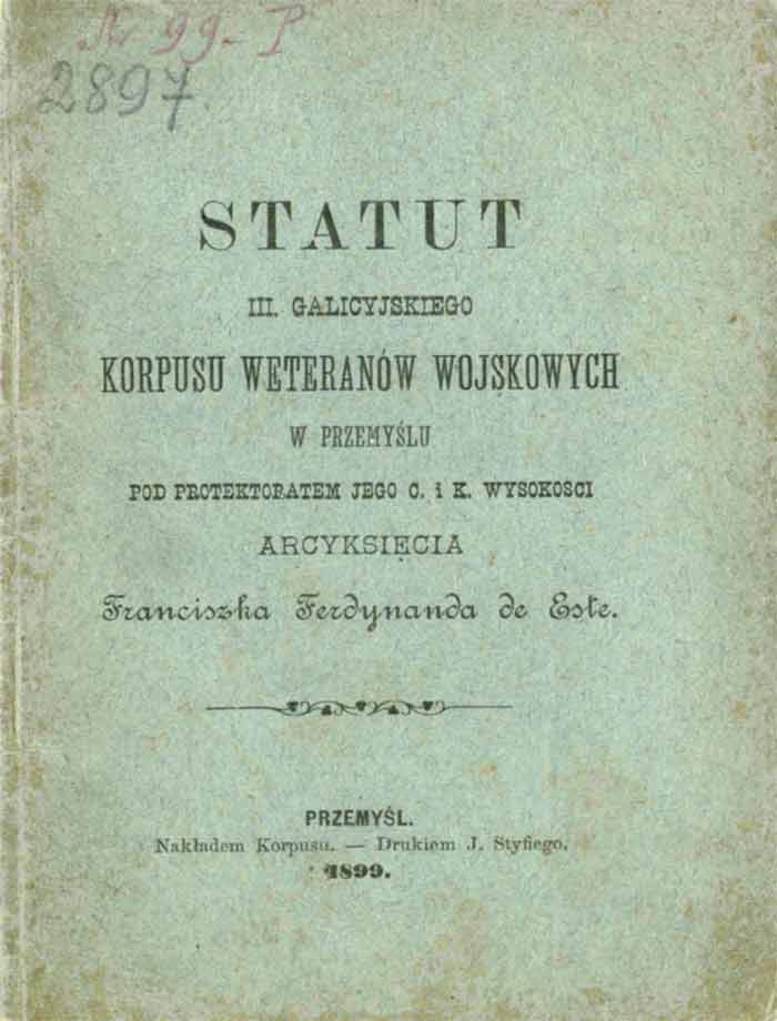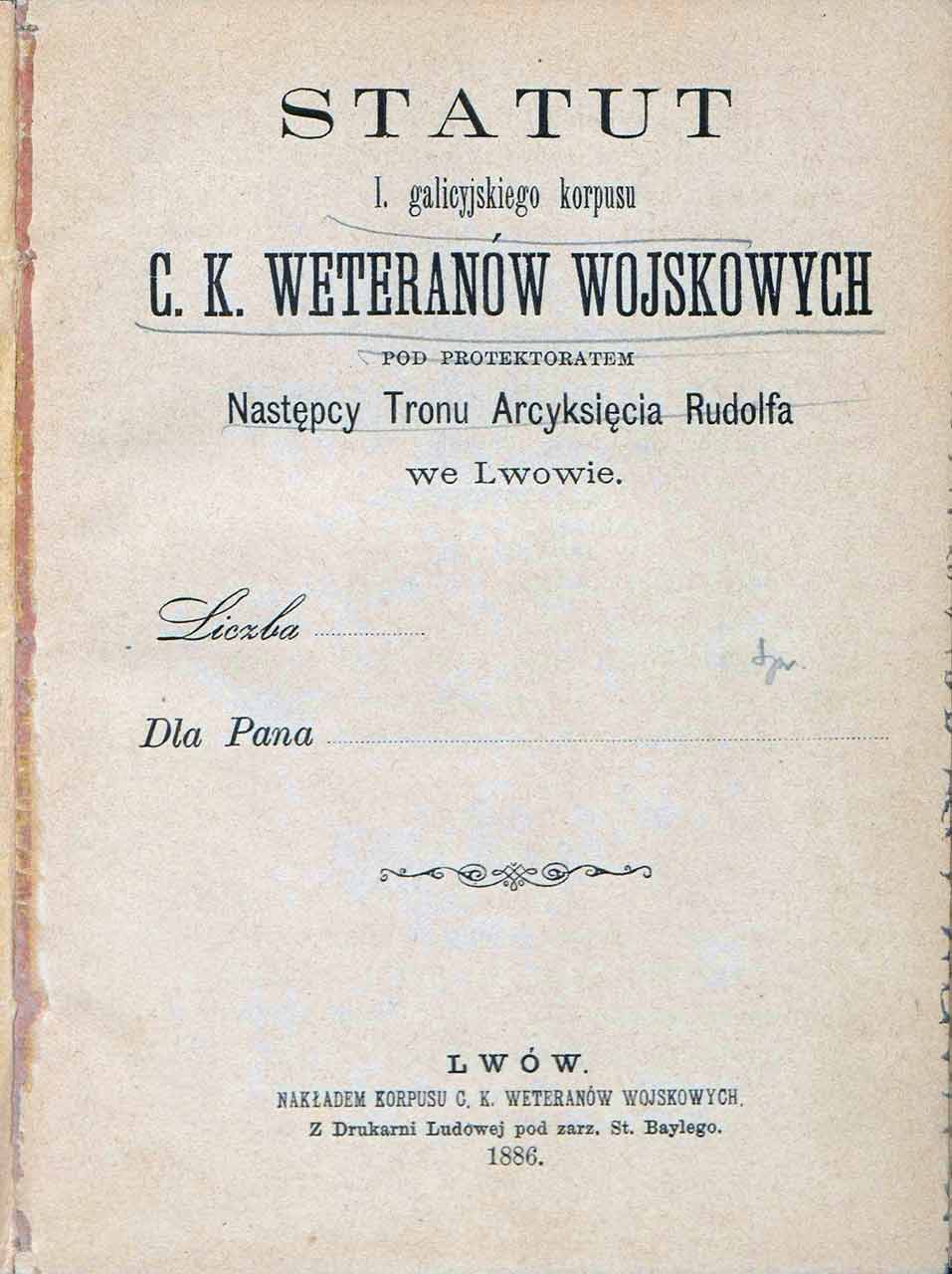 «Його Величність своєю постановою від 17 лютого 1865 року щодо вже існуючих в деяких частинах монархії і таких, що можуть утворитися в майбутньому, так званих “ветеранських товариств”, погодився на такі положення: За умови, що такі товариства в першу чергу задовольняють бажання взаємної підтримки членів у хворобі та інших нещастях, а потім для покриття похоронних витрат для померлих членів і їх гідного поховання, до чого ще може додаватися прагнення через тісніше згуртування розвивати справжній лояльний дух та інші хороші якості з попередньої військової служби, такі як: любов до порядку, поміркованість тощо, вступ до цих товариств дозволяється також усім інвалідам, які не перебувають у місцевих інвалідних будинках, а також резервістам, які не перебувають на активній службі. Так само пенсіонерам або тим, хто звільнився з активної служби з утриманням військового звання, дозволяється брати реальну участь у ветеранських товариствах за умови, що вони 1. не можуть обіймати в такому товаристві жодної посади, несумісної з офіцерською гідністю; 2. не можуть приймати грошову допомогу від товариства; 3. повинні на тих урочистостях, де присутній якийсь місцевий офіцерський корпус, приєднуватися до нього і, можливо, з’являтися лише на похоронах членів товариства; нарешті 4. повинні якомога більше уникати будь-якого конфлікту з політичними органами, якщо вони обіймають довірчу посаду в товаристві. Скрупульозний нагляд за дотриманням цих, як і всіх інших подальших умов, покладається на відповідні військові, гарнізонні округи, округи поповнень чи інші військові команди. Всі зазначені особи, які повністю або частково належать до військового об’єднання, можуть вступати лише в такі ветеранські товариства, які при загальному зборі не використовують одноманітної уніформи, крім місцевого костюма, не носять зброї, прапорів і не мають особливих відзнак, або використовують як такі лише одноколірні стрічки тощо. Активним генералам, штабним і старшим офіцерам за дозволом Його Величності також дозволяється приймати, якщо це стосується їх, вибори на почесних членів ветеранських товариств» (1).
