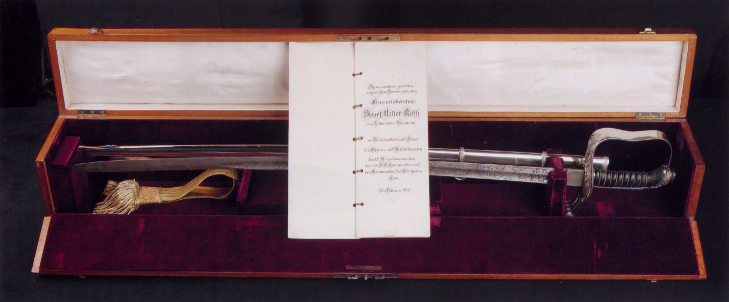 Це особливо екстравагантна парадна шабля, виготовлена на замовлення колишніх співробітників військового штабу Рота. На клинку викарбувані деталі служби Рота в період між 1914 і 1918 роками. Прикраса руків’я особливо вишукана — на ньому вигравіювані імператорська монограма «K» (Карл I), а також Австрійська й Угорська корони (HGM).