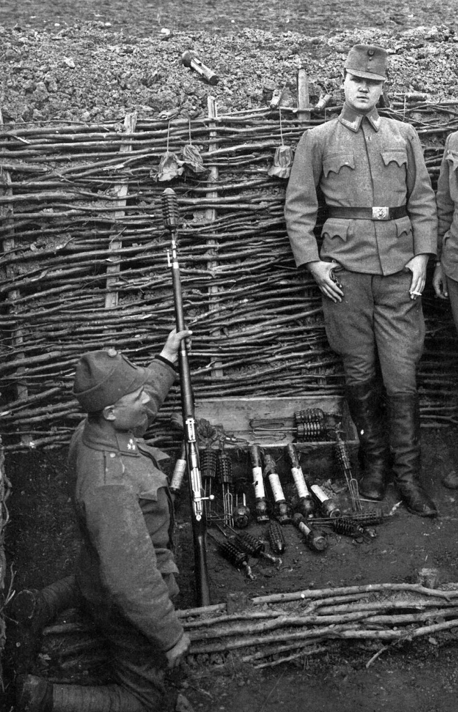 Пристосування для відстрілу гвинтівочних гранат в австро-угорському окопі, 1917 рік. Солдат стріляє гранатою «Zeitzündergewehrhandgranate» (bildarchivaustria.at)