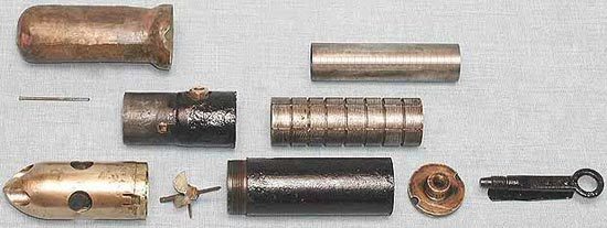 - Деталі «універсальної гранати». Зверху зліва лежить запобіжний ковпачок, який перешкоджав зведенню гранати від набігаючого повітря (weaponland.ru)