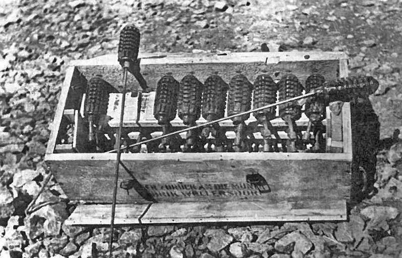 Різні типи ручних і гвинтівочних гранат, що були на озброєнні австро-угорської армії. Курси австро-угорських штурмовиків, 1917 рік. Зліва направо: німецька гвинтівочна граната «Gewehrgranate» зразка 1916 року і гвинтівочна граната «Zeitzundergewehrhandgranate» (лежать), «Kugelrohrhandgranate» 2-го типу, «Lakos» 1-го типу, «Zeitzünderhandgranate», «Rohrhandgranate», «Kugelrohrhandgranate» 4-го типу, німецька «Kugelhandgranate» зразка 1915 року, «Eierhandgranate» зразка 1917 року, німецька «Stielhandgranate» (bildarchivaustria.at)